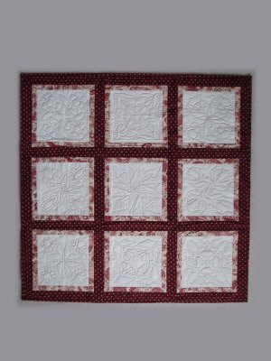 This beautiful nine patch redwork wallhanging has been designed by Lee Brown. She has taken nine different redwork designs that can be sewn on the machine or traditionally hand stiched and made into this super quilt. Finished size 44x44 inches.