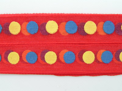 Organdy nylon ribbon in red with yellow and blue spots on it. Approximately 2 yards. 1/2 inch wide.