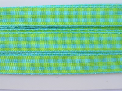 Gingham polyester ribbon in lime green and turquoise checks. Approximately 2 yards. 3/8ths of an inch wide.