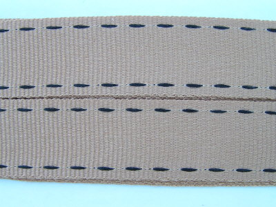 Lovely polyester beige ribbon timmed with black stitched edging. Approximately 2 yards. 5/8ths of an inch wide.