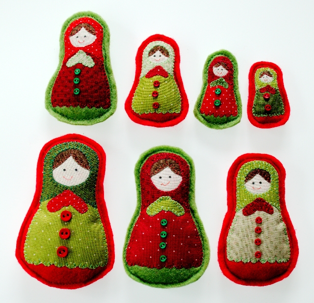 Inspired by a recent trip to Moscow, these super little Russian Dolls designed by Sue Trangmar are great fun and easy to make. There are seven in the set and they range in size from 4 inches down to 2 inches. The kit includes all of the felts, fabrics, buttons, fusible webbing and cord along with the pattern to make all seven. Please note that the kit does not include the toy stuffing.