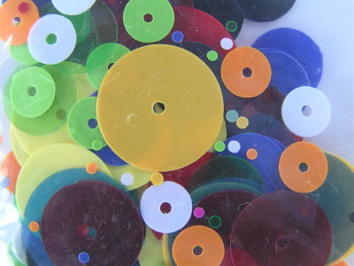 Gorgeous selection of small and large round sequins in red, orange, green, white, yellow and blue. Approximately 40 pieces.