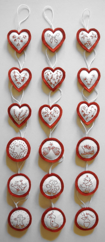 Another beautiful set of redwork Christmas decorations designed by Sue Rhodes. This time they are smaller approximately 3 inches high and there are 18 different designs for you to embroider. There are 9 heart shaped designs and 9 round designs.