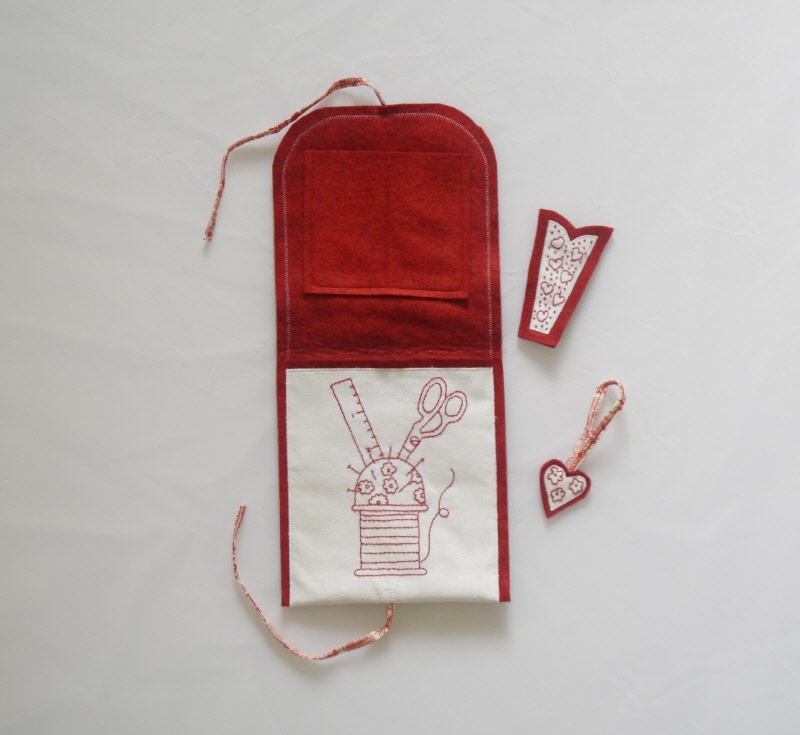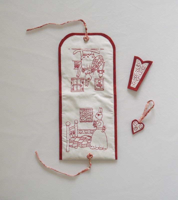 This gorgeous little sewing organiser features our love of redwork with the little bunny in her rocking chair and also another image of tucking up baby bunny in bed. The fabric has been pre printed with the design so it is ready for you to start stitching straight away. You will also receive the scissor keeper and tag panel to make as well. The organiser measures approximately 6 inches closed and 13 inches opened.