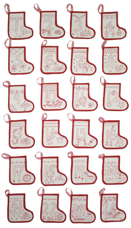These beautiful redwork stockings are sure to make an appearance every year at Christmas. Thgere are 24 little stockings for you to embroider and then they can be hung up ready to be filled with treats. They each measure approximately 4 x 4 inches.