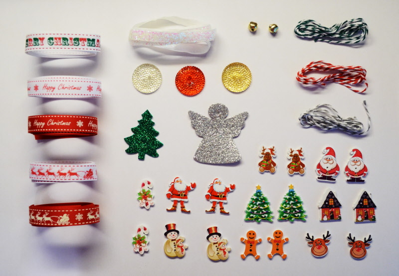 Who can resist this bag of lovely Christmas themed buttons, bells, ribbons and Christmas glitter shapes (designs may vary). The ribbon has been cut into 1 x metre pieces and there are 6 different designs on each of them. There are three different colourways of bakers twine, again cut into 1 x metre pieces. The buttons are an assortment of Christmas designs and also three different colour large sparkly buttons too!